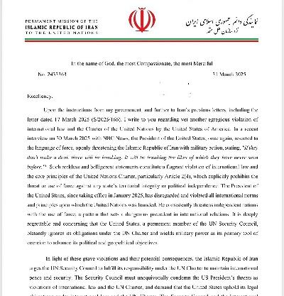 Carta del Ministro de Exteriores de Irán a las Naciones Unidas sobre la agresión militar del régimen sionista