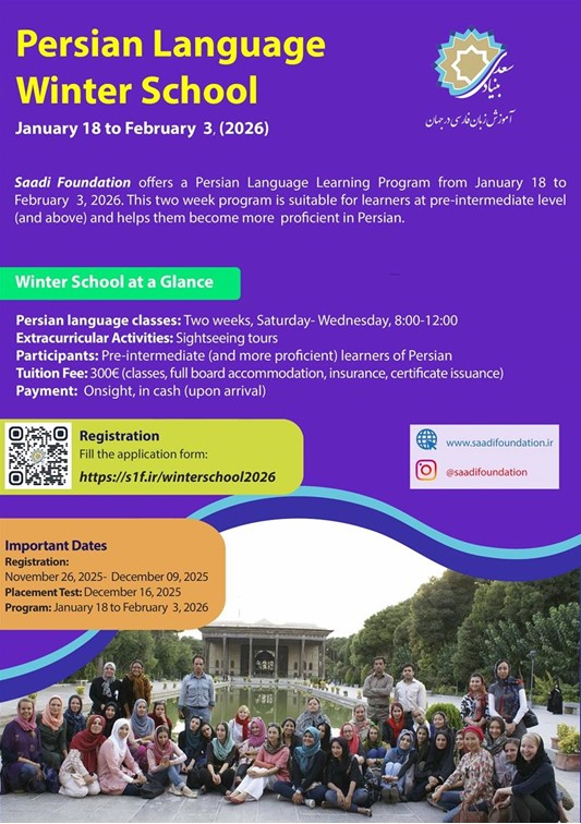 La Fundación Saadi ofrece el programa Escuela de Invierno de Lengua Persa, que se llevará a cabo del 18 de enero al 3 de febrero de 2026. Este programa intensivo de dos semanas está dirigido a estudiantes de persa de nivel preintermedio y superior, y tiene como objetivo mejorar las competencias lingüísticas de los participantes en el idioma persa.